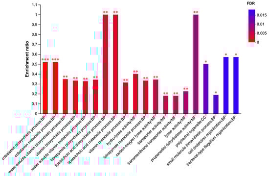 The analysis of the GO functional enrichment of the DEGs demonstrated the distinctions in gene function between the samples. The top 20 functional enrichments shown in Figure S5 and Figure 11 were predominantly involved in BP, specifically in the lipoteichoic acid biosynthetic process, lipoteichoic acid metabolic process, cobalamin biosynthetic process, cobalamin metabolic process, and hydro-lyase activity.