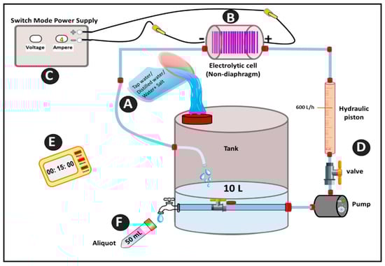 Circulating operational flow-chart of the production process of electrolyzed water: (A) water/salt solutions to be electrolyzed, (B) electrolytic cell, (C) power supply with a current controller, (D) hydraulic system, (E) timer, (F) sampler.