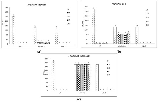 Viability (CFU/mL) of conidia of different fungi following contact with electrolyzed solutions obtained in the absence (eW) and presence of different electrolytes (eNaCl, eNaHCO3) sampled at different electrolysis times (0–60 min). Different letters indicate statistical significance according to the Fisher test (p < 0.05). Effect on a strain of (a) Alternaria alternata, (b) Monilinia laxa, (c) Penicillium expansum.