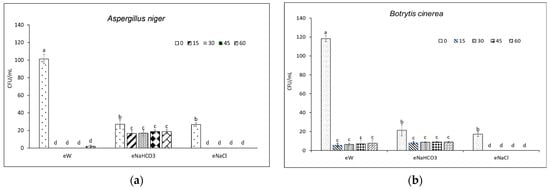 Viability (CFU/mL) of conidia of different fungi following contact with electrolyzed solutions obtained in the absence (eW) and presence of different electrolytes (eNaCl, eNaHCO3) sampled at different electrolysis times (0–60 min). Different letters indicate statistical significance according to the Fisher test (p < 0.05). Effect on a strain of (a) Aspergillus niger and (b) Botrytis cinerea.