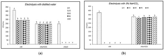 (a) Viability (CFU/mL) of a strain of Penicillium expansum following contact of conidia with electrolyzed solutions using distilled water in the absence (eW) and presence of different electrolytes (eNaCl, eNaHCO3) sampled at different electrolysis times (0–60 min); (b) Viability (CFU/mL) of a strain of P. expansum following contact with electrolyzed solutions using tap water in the absence (eW) and presence of 3% NaHCO3 (eNaHCO3). Different letters indicate statistical significance according to the Fisher test (p < 0.05).
