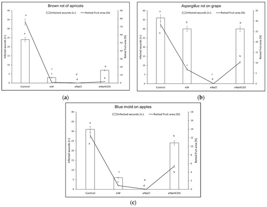 Concerning brown rot on apricots (Figure 5a), Aspergillus rot on table grapes (Figure 5b), and blue mold on apples (Figure 5c), eNaCl completely suppressed infections as compared to the control. Even eW reduced the incidence and severity of blue mold on apples up to 93%, Aspergillus rot on table grapes up to 76%, and brown rot on apricots up to 98%. Finally, eNaHCO3 showed a considerable effect against disease severity and, among diseases, particularly on brown rot on apricots (up to 96% reduction).