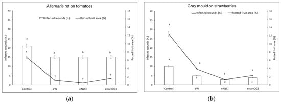 Concerning Alternaria rot on tomatoes (Figure 6a), no differences were observed among the treatments concerning the disease incidence, whereas, considering severity, eNaCl caused a reduction by 92%, followed by eW with an 82% reduction, and eNaHCO3 with a 75% reduction. Regarding gray mold on strawberries (Figure 6b), eNaCl caused a reduction of 70 and 89% of disease incidence and severity, respectively, followed by eNaHCO3 with a 60 and 81% reduction, and eW with a 50 and 69% reduction.