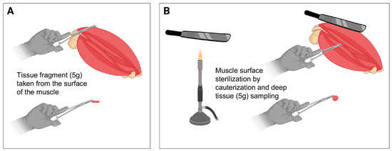 Workflow of muscle tissue sampling. The sampling was divided into two phases: (A) First, 5 g of tissue from the surface of the muscle block was taken. (B) Thereafter, the surface of the muscle was sterilized by cauterization with a hot metal spatula, and 5 g of deep tissue was also taken. The figure was created with BioRender.com.