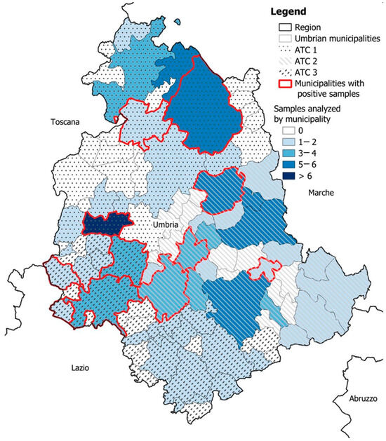 The number of WBs to be analyzed was distributed over the entire regional territory on the basis of the Umbrian hunting territorial areas (ATCs). The number of animals to be tested per ATC was calculated by taking into account the percentage of positivity estimated during the 2021–2022 hunting season [16].