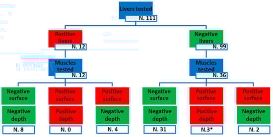 Figure 4 summarizes the flow of samples analyzed for all matrices considered: liver, tissue taken from the surface of the meat block, and tissue taken deep from cautery.