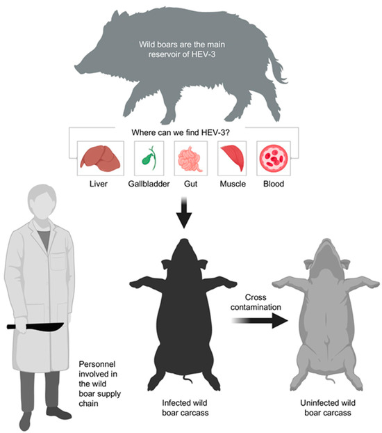 As in humans, the target organ for HEV infection in WB is the liver. However, the consumption of meat and muscle preparations could also be a risk factor for HEV infection in humans. Although the tropism of the virus for tissues other than the liver has not been demonstrated yet, it has been shown that HEV RNA can be detected in muscle samples from animals whose liver had tested positive for the presence of the viral genome [16,17,18]. Further to this, meat contamination occurs by cross-contamination during food production due to unsuitable working conditions.