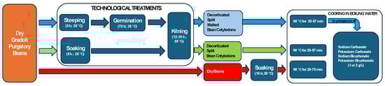 To reduce the optimal cooking time of malted and decorticated Gradoli Purgatory beans, they were cooked using different monovalent salt solutions. The salt concentrations used (1 or 2 g/L) were considerably lower than those tested previously [8,13,17] to avoid imparting any salted taste to the cooked beans.