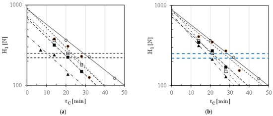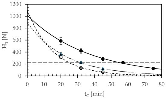 Effect of cooking time (tC) on the experimental hardness H1 of GPBs in various forms: 16 h pre-soaked (●, −); unsoaked, decorticated, and split (○, - - -); malted, decorticated and split (▲, - - -). The continuous, dotted, and broken lines were plotted using Equation (1) and the empirical coefficients listed in Table 3. The horizontal broken line represents the H1 value that indicates the beans are adequately cooked.