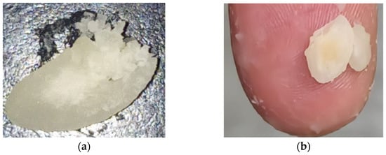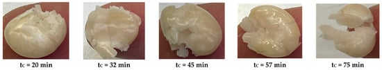 The pinch test was not effective in precisely determining the optimal cooking time for beans. All samples cooked for more than 20 min tended to disintegrate when pressed between the thumb and index finger (Figure 4). As the cooking time (tC) increased from 20 to 32 min, the beans lost small pieces. For cooking times exceeding 45 min, the beans became increasingly pasty and softer when pressed, though they still retained some degree of cohesion (Figure 4).