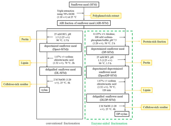 Sunflower (Helianthus annuus L.) stands as one of the world’s most widespread cultivated oil crops, alongside soybean and rapeseed [1,2]. Its good nutritional properties make it widely utilized in the food sector [1]; however, its greatest economic importance comes from the high oil content in the seeds [3] and its potential for the production of a high-quality oil that represents one of the most preferable and widely used vegetable oils in the world [1,4]. Despite ongoing efforts to enhance the oil extraction process, a significant portion of solid residues (hulls, meals, and cakes) continues to be generated worldwide [5]. These oilseed residues are usually discarded as waste or utilized as a cheap component of animal feed for various livestock species, with a negligible application in the human diet [6]. Sunflower meal (SFM), the primary byproduct of sunflower oil extraction, holds great potential as a source of proteins, dietary fibers, phenolic compounds, and minerals yet remains underutilized [7]. Its profitable industrial application is currently limited due to its comparatively low protein content [8], high levels of undigestible carbohydrates [9], and finally the abundance of antinutritional factors [10], especially phenolics, which may form complexes with proteins, thus leading to reduced functionality and digestibility of meals [5,11]. Accordingly, there has been growing interest in their profitable reutilization aligning with the principles of circular economy and sustainable development. The valorization of SFM could result in the preparation of multiple products with added value for the food and pharmaceutical industries [11]. The most commonly utilized methods for the valorization of SFM are based on the extraction of protein fraction [8], since there is a constant increase in demand for relatively cheap and adequate protein sources [12]. This is not surprising, bearing in mind the nutritional and technological advantages of SFM proteins [13,14]. Nevertheless, in view of fully achieving biorefinery goals, the polyphenolic and carbohydrate fractions should also be considered for valorization. Phenolic compounds are frequently eliminated within the first steps of the protein isolation process, but recent data show that researchers are shifting towards their utilization upon gaining new knowledge about the utility of these fractions [10,15]. However, the systematic valorization of the carbohydrate fraction, which makes up to 52% of dry matter (DM), depending on the oil extraction process [16], is still insufficiently studied. Conventional extraction methods to valorize carbohydrate fractions in different byproducts and waste materials, based on multi-step extractions using acids and alkalis, come with many limitations, such as a loss in fiber functionality, laborious operation with low extraction efficacy, and, more importantly, environmental unacceptability, since the rigid lignocellulose structure requires severe pretreatments to facilitate the efficient extraction of the mentioned fractions [17]. Pectic compounds are usually extracted using mineral or organic acids [18,19], while traditional hemicellulose extraction methods are mostly based on the alkaline extraction (sodium or potassium hydroxides) of xylan with or without a delignification step [20,21,22]. Delignification is usually provided with sodium chlorite, hydrogen peroxide, or peroxyacetic acid, with the aim of obtaining purer xylan fractions, since alkaline treatment also partially solubilizes present lignin [23]. These methods have caused unavoidable hemicellulose degradation, and therefore, alternative means of isolation have been purposed, such as organic solvent treatments using different organic solvents (e.g., dimethyl sulfoxide, mixtures of dimethyl sulfoxide with other compounds and dioxane), but these methods have provided significantly lower yields of the wanted compounds, probably being restricted to the water-soluble fraction of xylan [24]. Additionally, the application of complementary emerging technologies such as microwaves, ultrasound, or enzymatic assistance is currently growing [25,26,27]. In the field of sunflower carbohydrate valorization, only sunflower heads were previously utilized for pectin extraction [28,29,30,31], while SFM was not subjected to either pectin or xylan extraction to date.
