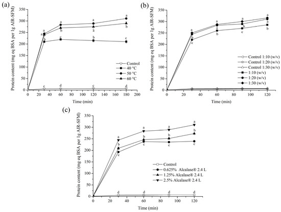 The influence of temperature (a), AIR-SFM-to-buffer ratio (b), and enzyme (Alcalase® 2.4 L) concentration (c) on the enzyme-aided protein extraction process. Different characters on each graph at the same examination time indicate a statistically significant difference between (a) the control sample and temperatures, (b) the AIR-SFM-to-buffer ratios (it was statistically confirmed that each examined ratio is significantly different from its control), and (c) the control sample and different enzyme concentrations.