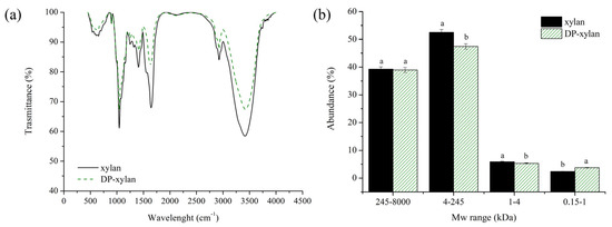 FTIR spectra (a) and distribution of molecular weights (Mw) (b) of the obtained xylans. Different characters on each MW range indicate a statistically significant difference between xylans.