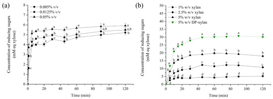 Time course of XOS production using Rohalase® SEP-Visco: (a) Influence of enzyme concentration on hydrolysis of xylan; (b) influence of substrate concentration of xylan and DP-xylan. Different characters on each graph at the same examined time point to a statistically significant difference between (a) enzyme concentrations and (b) substrate concentrations.