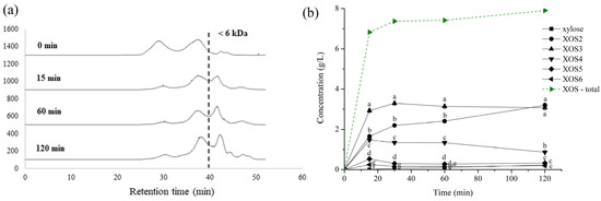 (a) HPSEC-ELSD chromatograms of XOS production from DP-xylan for reaction times 0, 10, 60, and 120 min. The vertical line represents 6 kDa (DP of approximately 50). (b) Time course of XOS production with achieved concentrations for compounds up to XOS6, analyzed using HPLC-UV. Different characters on the graph at the same examined time indicate a statistically significant difference between the concentrations of individual XOSs.