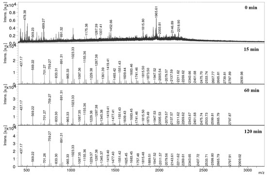 MALDI-TOF MS analysis of DP-xylan reaction mixture in various reaction times.