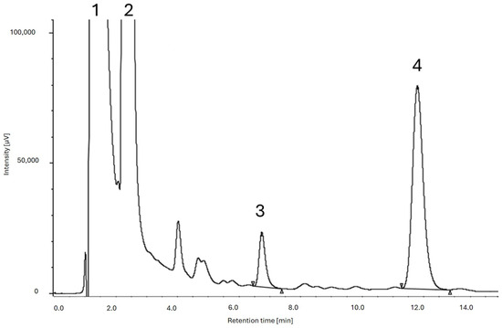 UHPLC-DAD analysis of the RYR water formulation extract. Chromatographic conditions: C4 stationary phase, mobile phase: ACN and water (0.1% of acetic acid) 50:50 (v/v), flow rate 0.2 mL min−1; detection at 237 nm: (1) saccharin, (2) sodium benzoate, (3) AMK, and (4) LMK.