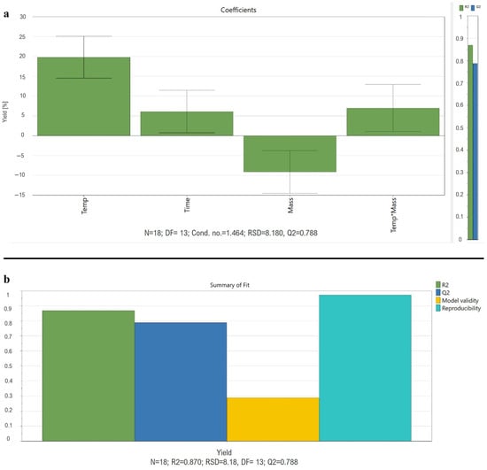 (a) Coefficient plot reports the primary effects of temperature, time, mass, and the interaction effect of temperature × mass for the MK yield of extraction; (b) Summary of Fit reports values regarding R2, Q2, model validity, and reproducibility of the performed DOE.