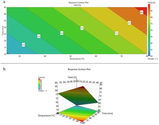 Three-dimensional response contours of MK extractions with time, temperature, and yield at a solid/solvent 5 mg mL−1 ratio.