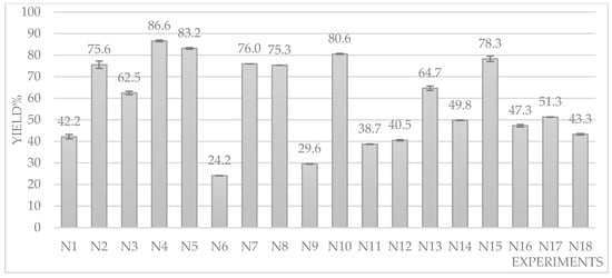 By using the data collected during the DOE study, the total MK yield was calculated and reported in Figure 5, showing an important variation in yield, with a minimum of 24.2 ± 0.1% up to over 86.6 ± 0.4%, depending on the extraction conditions.
