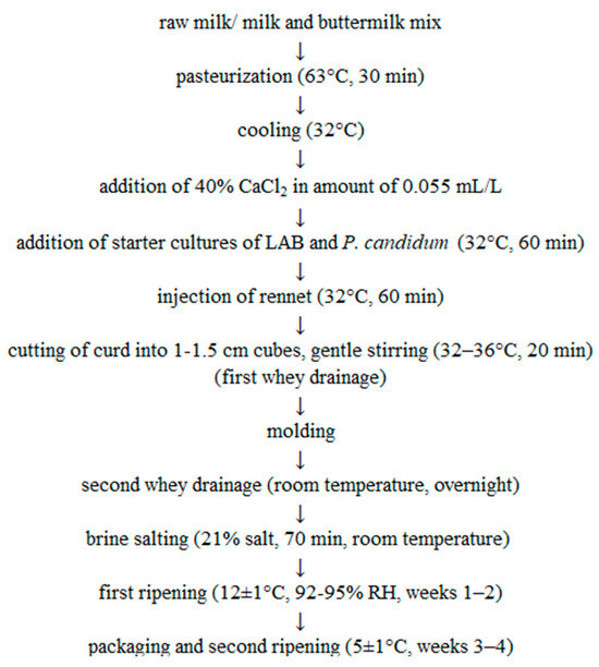 Camembert-type cheese was made from raw cow milk purchased from a local farmer and from buttermilk. Within the study, we manufactured three variants of cheese: C—control, made entirely from milk; BM10—made from milk with a 10% (w/w) addition of buttermilk; and BM20—made from milk with a 20% (w/w) addition of buttermilk. Production was carried out according to the methodology presented by Bae et al. [40], with slight modifications (Figure 1). After pasteurization and cooling of the milk or milk-and-buttermilk mixture, calcium chloride and starter cultures were added. We simultaneously added culture MST (Biochem s.r.l., Rome, Italy) containing Lactococcus lactis subsp. lactis, Lactococcus lactis subsp. cremoris, Streptococcus salivarius subsp. thermophilus, and culture PC (Biochem s.r.l., Rome, Italy) containing Penicillium candidum. Both cultures were in lyophilized form for direct milk inoculation. For coagulation, natural liquid rennet (Biochem s.r.l., Rome, Italy) in addition 0.2 mL/L was used. During the first 14 days of ripening, cheese discs were turned every day. After that period, all cheese discs were covered with mold. On the 14th day, each cheese disc was packaged in polyethylene-coated paper and placed in new conditions for 14 additional days. In the production process, 25 discs of each cheese variant were obtained. The mass of each disc was approximately 120 g, the diameter was approximately 9 cm, and the height was approximately 3 cm. The experiment was performed in duplication. Directly after salting, cheese discs were weighed, and the production yield was calculated by dividing the weight of cheese by the weight of milk/milk-and-buttermilk mix, and the results were presented as kilograms of cheese per 100 kg of milk/milk-and-buttermilk mix [41].
