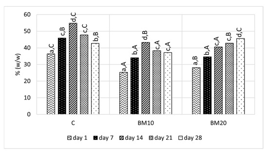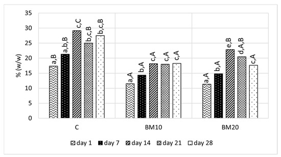 Fat content in Camembert-type cheese during ripening. Explanatory notes: C—control Camembert-type cheese; BM10—Camembert-type cheese with 10% buttermilk; BM20—Camembert-type cheese with 20% of buttermilk. Different small letters (a–e) indicate significant differences in the same cheese on different ripening days. Different capital letters (A,B,C) indicate significant differences between cheese samples on the same ripening day (p ≤ 0.05).