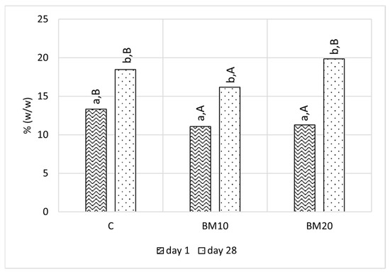 Protein content in Camembert-type cheese at the beginning and end of the ripening period. Explanatory notes: C—control Camembert-type cheese; BM10—Camembert-type cheese with 10% buttermilk; BM20—Camembert-type cheese with 20% of buttermilk. Different small letters (a,b) indicate significant differences in the same cheese on different ripening days. Different capital letters (A,B) indicate significant differences between cheese samples on the same ripening day (p ≤ 0.05).