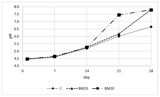 The pH of Camembert-type cheese during the ripening period. Explanatory notes: C—control Camembert-type cheese; BM10—Camembert-type cheese with 10% buttermilk; BM20—Camembert-type cheese with 20% of buttermilk. Standard deviations and results of the HSD Tukey test are presented in the Appendix A.