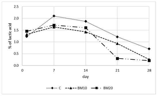 The initial lactic acid content was 1.23, 1.32, and 1.46, respectively, for the control, BM10, and BM20 cheese. An increase in the lactic acid content was observed between days 1 and 7, which was associated with lactose fermentation by starter bacteria. On day 7, the lactic acid content was 2.10%, 1.64%, and 1.71%, respectively. During the remaining period, lactic acid content decreased dynamically, reaching the lowest values on day 28 (0.71%, 0.26%, and 0.21%, respectively). Similar changes in acidity during the ripening of Camembert-type cheese have also been observed by other authors [7,8,40,47,50].