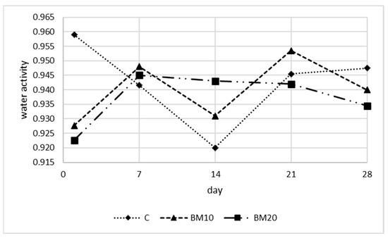 The water activity of Camembert-type cheese during the ripening period. Explanatory notes: C—control Camembert-type cheese; BM10—Camembert-type cheese with 10% buttermilk; BM20—Camembert-type cheese with 20% of buttermilk. Standard deviations and results of the HSD Tukey test are presented in the Appendix A.