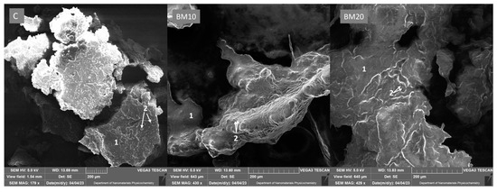 SEM images of ripened Camembert-type cheese microstructure. Explanatory notes: C—control Camembert-type cheese; BM10—Camembert-type cheese with 10% buttermilk; BM20—Camembert-type cheese with 20% of buttermilk; 1—protein matrix; 2—fat globules.