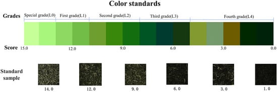 Green tea is widely consumed around the world due to its pleasant taste and potential health benefits [1,2]. Chongqing, a city located in southwestern China, is recognized as a potential origin of tea [3]. Chongqing lies in the prime region for green tea cultivation and is celebrated for its bountiful yield of needle-shaped green tea. Notably, Yongchuan Xiuya is recognized as a unique Chinese agricultural specialty valued nationwide for its straight appearance, light green color, delicate and aromatic profile, as well as its umami taste. Additionally, it represents one of China’s most quintessential needle-shaped green teas. Therefore, developing a swift, objective, and precise assessment approach for evaluating the quality of needle-shaped green tea is significant for the tea industry in Chongqing and nationwide. When evaluating the quality of tea, several attributes are considered, including appearance, aroma, taste, and other sensory factors [4]. Among these attributes, the appearance, particularly the color, plays a crucial role in green tea as it greatly influences purchasing decisions [5]. Traditional methods of assessing tea quality rely on sensory evaluation and quantitative descriptive analysis [6]. However, these techniques require specialized training and have a steep learning curve, resulting in high costs, time-consuming processes and inaccuracy [7]. Consequently, consumers often associate higher prices with higher quality due to a lack of standardized evaluation methods [8]. Therefore, it is essential to establish an accurate, efficient, and objective approach to tea quality evaluation, specifically in terms of assessing appearance. Implementing such standardization would provide valuable guidance to consumers in the market.