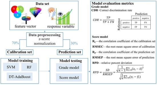 Before establishing the model, the color data set was divided into calibration and prediction sets in the ratio of 7:3 [42]. The objective is to prevent overfitting resulting from additional dataset partitions [43]. Prediction models for color sensory quality grades and scores were then established using SVM, RF, and DT-Adaboost algorithms. Prior to this, the Z-score method [14,44] was applied to preprocess the original data.