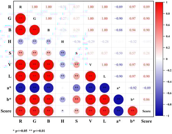 Pearson’s correlation coefficients (r) and two-tailed tests were conducted to analyze the relationship between the color features of green tea and sensory quality, as depicted in Figure 4. The color characteristics of the green tea exhibited significant correlations with sensory qualities. Specifically, the R, G, B, S, V, L, and b* values showed negative correlations, while the a* and H values demonstrated positive correlations with sensory qualities. These findings suggest that greener color and higher saturation levels are generally associated with better sensory qualities, confirming the findings of previous research [47].