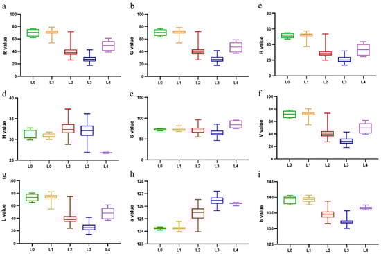 Box plots of image color characteristics: (a) R; (b) G; (c) B; (d) H; (e) S; (f) V; (g) L; (h) a; and (i) b.