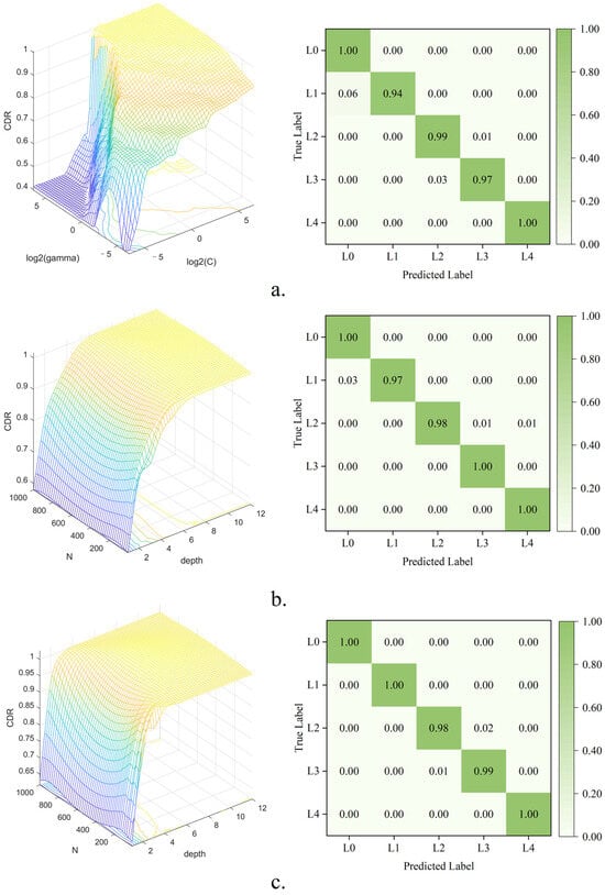 Considering that all three models have key parameters that impact the model results, the grid search method was used to optimize these models to obtain the optimal parameters. The results of the hyperparameter search are shown in Figure 6. Table 1 presents the classification results for estimating the color of dried green tea using the various machine learning models. The best result after hyperparameter search was used for each model. As shown in Table 1, all the models demonstrated high accuracy in assessing the color grades of tea. Specifically, the SVM model achieved a CDR of 97.74%, while the RF and DT-Adaboost models achieved CDRs of 98.12% and 98.50%, respectively, in the prediction set. Notably, the DT-Adaboost model achieved the optimal discrimination results. The confusion matrixes of the models are shown in Figure 6. The confusion matrixes indicate that the recall value of L0 and L4 is nearly 100%, which means that there is no misjudgment. The misjudgments mainly occur between L1, L2 and L3. A comparison of the accuracy, precision, and F1 score data reveals that the performance of the three algorithmic models in grade evaluation is closely matched. The identified features are capable of effectively discerning varying grades of tea based on distinct color characteristics.