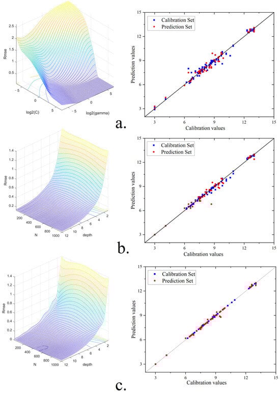 The parameters that correspond to the lowest RMSEC value were selected for model training after the hyperparameter search. As shown in Table 2, the SVM, RF, and DT-AdaBoost regression models had respective RMSEC values of 0.313, 0.296, and 0.162, and corresponding RPD values of 7.668, 8.122, and 14.827. These results indicate that all three models exhibit good predictive performance. Notably, the DT-AdaBoost model had the lowest RMSEP value and the highest RPD, with Rp, Rc, and RMSEC values of 0.995, 0.999, and 0.020, respectively.