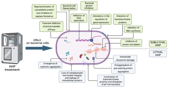 The effectiveness of bacterial inactivation largely depends on the endo- and exogenous factors occurring in parallel with the applied pressure. Stress caused by environmental conditions such as heat shock, cold shock, or osmotic stress may also cause increased tolerance to pressure. For example, Listeria monocytogenes under stress conditions enters a dormant phase and becomes more barotolerant [33]. It is worth emphasizing that bacterial cells that are resistant to heating are also more resistant to pressure. Moreover, the susceptibility of microorganisms to HHP depends on the physiological state of the cell. Microorganisms in the logarithmic growth phase are always more sensitive to high pressure than in the stationary phase. Furthermore, research confirms that the prophages and bacterial defense systems related to preventing the transfer of genetic material may be involved in the survival of bacteria in conditions of increased pressure [33].