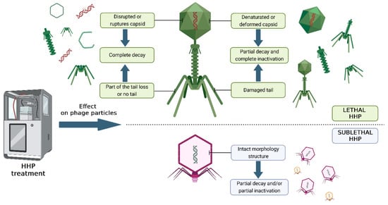 An effective method of eliminating spores may be the use of a selected cocktail of strictly lytic phages isolated from the environment, combined with the HHP technique. This approach will enable the reduction in the vegetative forms of bacteria and the germination of spores under the influence of pressure, which will then be eliminated by phage monoculture or a cocktail of various phages. To avoid re-multiplying bacteria from induced spores, bacteriophages can be added to the final product before HHP is used. In this case, the phages must be stable within the applied pressure range. Bacterial viruses can also be applied after HHP as additional protection against the target bacteria [106,107]. Combining these two methods can significantly improve the microbiological safety of food while minimizing the impact on food quality and nutritional value. In addition, the use of the pressure values and process digestion time required for spore germination contributes to lower production losses, indirectly saving energy. The effect of pressure on bacteriophages has not been fully explored, but the main mechanisms of the inactivation of bacterial viruses can be distinguished, which are presented in Figure 2.