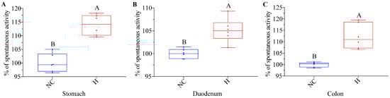 This investigation was carried out in accordance with the method described in our prior study [], though with modifications. Twelve mice had been fasting without water for 24 h, and then the animals were anesthetized to isolate the muscle strips of their stomachs, duodenums, and colons. Eighty microliters of NRG_H (H) was introduced into the Tyrode solution to serve as the treatment condition.