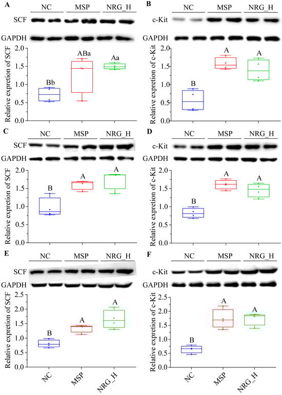 Compared to the NC group, following a one-week administration period, the NRG_H group exhibited a statistically significant elevation in SCF and c-Kit protein expression within their stomachs (p < 0.05 and p < 0.01, respectively). The magnitude of these alterations paralleled those observed in the MSP group (Figure 4A,B). Similarly, in the duodenum and colon tissues, the changes in SCF and c-Kit protein expression mirrored those observed in the stomach tissues (Figure 4C–F).