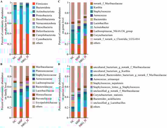 At the phylum level, the predominant microbial groups identified were Firmicutes, Bacteroidetes, Actinobacteria, Proteobacteria, and Desulfobacterota, with Firmicutes and Bacteroidetes constituting the highest proportions. Specifically, in the NC, MSP, and NRG_H groups, the proportions of Firmicutes and Bacteroidetes were 60.76% and 25.16%, 58.03% and 30.56%, and 39.55% and 50.36%, respectively. This indicated that following the NRG_H treatment, the proportion of Bacteroidetes approximately doubled. Notably, Verrucomicrobiota demonstrated a marked elevation in abundance within the MSP group relative to the NC group, with an increase of 183.69%, but in the NRG_H group, only a 31.14% increment was observed. The abundance of Actinobacteriota and Desulfobacterota decreased after treatment, with the MSP group seeing reductions of 41.55% and 42.89% and the NRG group experiencing reductions of 59.22% and 90.28%, respectively (Figure 6A).