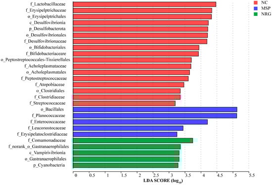 At the family level, the abundances of Muribaculaceae and Moraxellaceae in the MSP group experienced reductions of 10.44% and 70.41%, respectively, whereas in the NRG_H group, they increased by 78.59% and 76.15%, respectively. The family Planococcaceae demonstrated a significant post-administration increase, with abundances 147.76- and 77.41-fold higher in the MSP and NRG_H groups, respectively, compared to the NC group. Bacteroidaceae displayed analogous patterns, with their abundances in the MSP and NRG_H groups being 6.80- and 7.67-fold greater than in the NC group, respectively. Conversely, the abundances of Staphylococcaceae decreased post-administration, with reductions of 78.76% observed in the MSP group and 81.19% in the NRG_H group (Figure 6B).