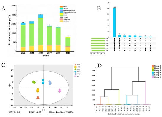 A total of 127 volatile compounds were detected by HS-SPME and SBSE combined with GC-MS: 52 esters, 24 alcohols, 14 terpenes, 13 aldehydes, 11 ketones, three phenols, two nitrogen heterocycles, two oxygen heterocycles, and six other compounds (Table S1). Figure 1B shows that 101 of 127 volatile compounds were present in all samples of jasmine tea. Five of these compounds could only be detected in the 2011 sample: pentanal, 2-ethyl-furan, butanoic acid methyl ester, 3-methyl-1-butanol, and benzeneacetaldehyde. Figure 1A shows that esters had the highest proportion of these aromatic compounds, followed by alcohols and aldehydes, as reported in previous studies [,]. The total concentration of these three types of compounds accounted for 91.72–98.06% of the overall volatile compound concentration (Table S1). The concentrations of most of the volatile compounds exhibited an initial rise followed by a subsequent decline as the storage period extended. For example, the ester concentration was 2346.467 μg/L in the 2022 sample, increased to 2897.34 μg/L in the 2020 sample, and decreased to 973.469 μg/L in the 2011 sample. In contrast, the concentration of aldehydes increases with an increase in storage time, being 64.853 μg/L in the 2011 sample but only 16.614 μg/L in the 2022 sample, but most aldehydes may bring a fatty aroma to jasmine tea []. Notably, the concentration of total volatile compounds was the highest in the 2020 sample, being 4050.985 μg/L, and the floral, fruity, and fresh characteristics of the jasmine tea were the strongest in this sample. The 2011 sample with the longest storage time had the lowest aroma compound concentration, namely 1599.412 μg/L, and this concentration was significantly lower than that of the other five samples.