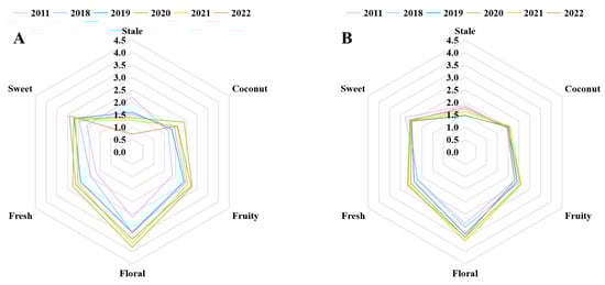 To more clearly determine the differences between the six jasmine tea samples with different storage durations, we conducted a QDA experiment for aroma. The evaluation team provided scores for each jasmine tea infusion for the six aroma terms: stale, coconut, fruity, floral, fresh, and sweet []. The radar chart shows the fluctuation in the intensity of the fruity, floral, coconut, and fresh aromas during storage, which first increased and then decreased, and the highest intensity of the four aromas was in 2020. Whereas the intensities of the sweet and stale aromas decreased and increased, respectively, during storage (Figure 3A). Hence, it can be found that the change of six aromas and the concentration of corresponding aroma compounds was consistent.