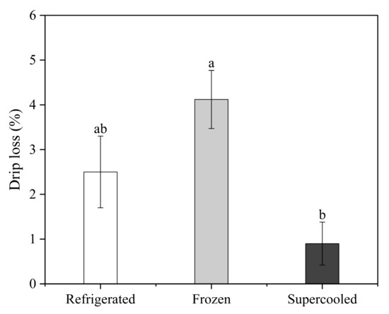 Mean values of drip loss in samples after 10 days of storage under refrigerated, frozen, and supercooled conditions. Different letters indicate significant differences within the same storage time (p < 0.05).