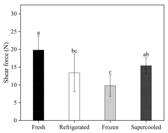 Mean values of Warner–Bratzler shear force of samples after 10 days of storage under refrigerated, frozen, and supercooled conditions. Different letters indicate significant differences according to Tukey’s test (p < 0.05).
