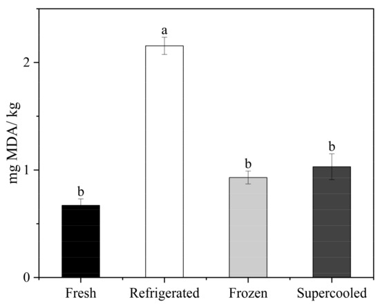 Mean values of degree of lipid oxidation of samples after 10 days of storage under refrigerated, frozen, and supercooled conditions. Different letters indicate significant differences according to Tukey’s test (p < 0.05).