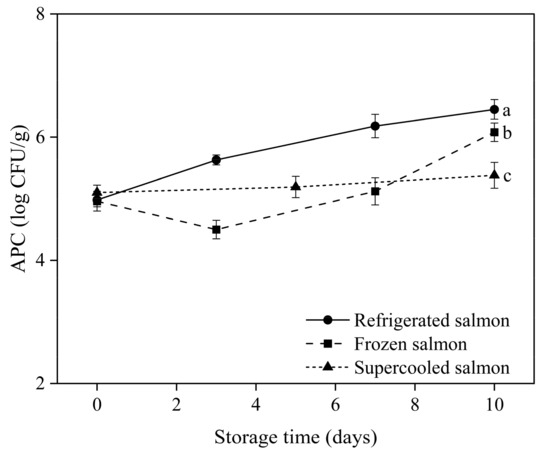 The aerobic plate count (APC) test was performed on salmon stored under three distinct conditions: refrigeration, freezing, and supercooling. Figure 6 illustrates that the APC of refrigerated and frozen–thawed salmon exhibited significant growth over the 10-day storage period. Conversely, the APC values of the supercooled salmon samples remained relatively stable during the same period. According to Kim et al. [37], the microbiological quality of raw ready-to-eat seafood can be categorized into three levels: satisfactory (APC < 5 log CFU/g), acceptable (5 log CFU/g ≤ APC ≤ 6 log CFU/g), and unsatisfactory (APC ≥ 6 log CFU/g). The refrigerated samples reached ‘unsatisfactory’ APC levels of 6.18 ± 0.16 log CFU/g after 7 days, while the frozen samples showed 6.08 ± 0.15 log CFU/g after 10 days. In contrast, the supercooled salmon maintained an average APC of 5.38 ± 0.21 log CFU/g even after 10 days, which falls within the ‘acceptable’ range. The supercooled salmon samples were able to sustain a low subzero temperature, effectively slowing down bacterial growth during storage. Additionally, these samples did not require a thawing step before consumption as the fish did not freeze. While low-temperature thawing processes are beneficial in minimizing physical and biochemical changes in meat and fish products, the conventional thawing method used in this study could potentially increase bacterial populations [38,39].