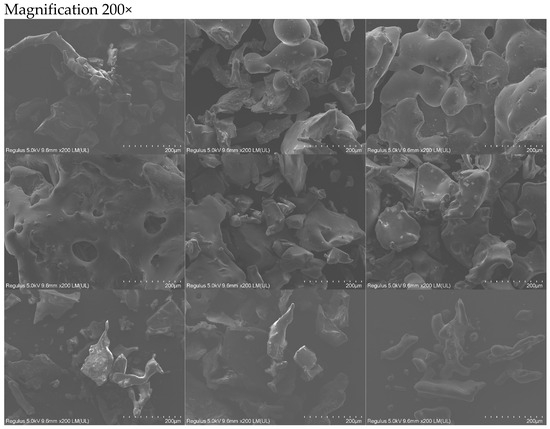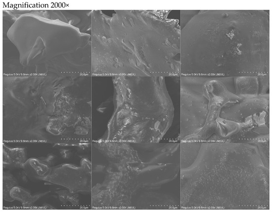 The morphology of the digestion products was observed via SEM. The product powder was immobilized on a conductive adhesive with a voltage of 5.0 kV, a lens height of 9.8 mm, and magnifications of 200×, 500×, 1000×, and 2000×.